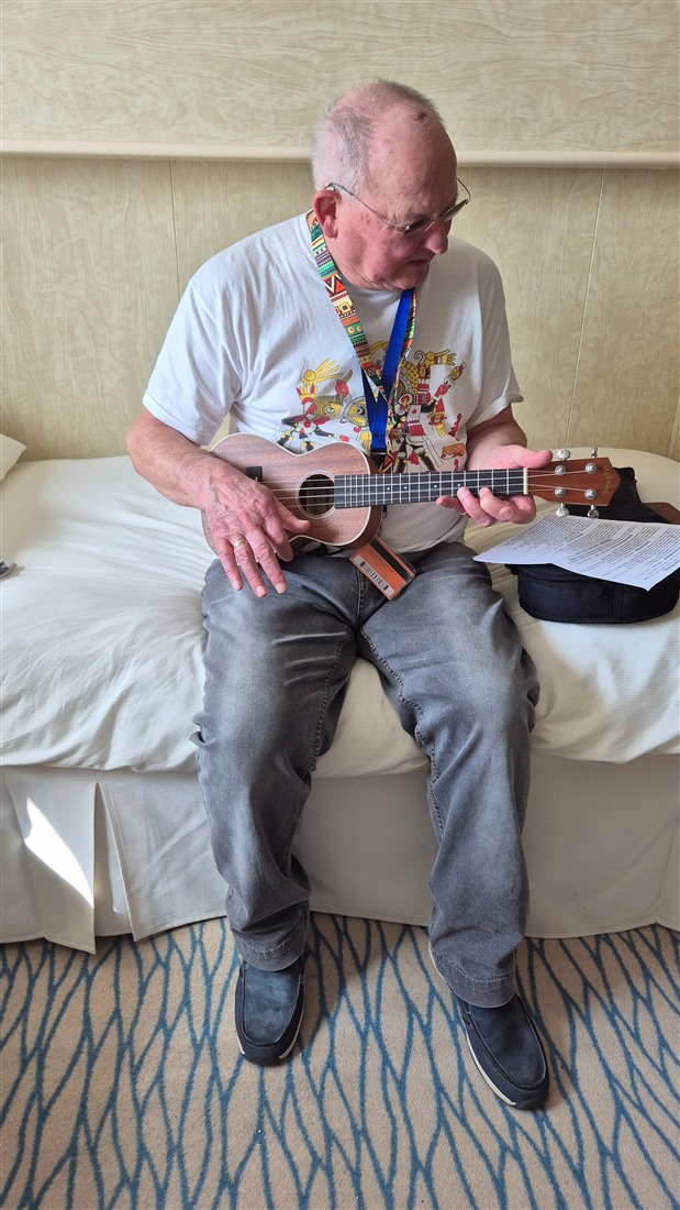 Jan zat op ukelele-les. Ik volgde interessante lezingen en borduurde