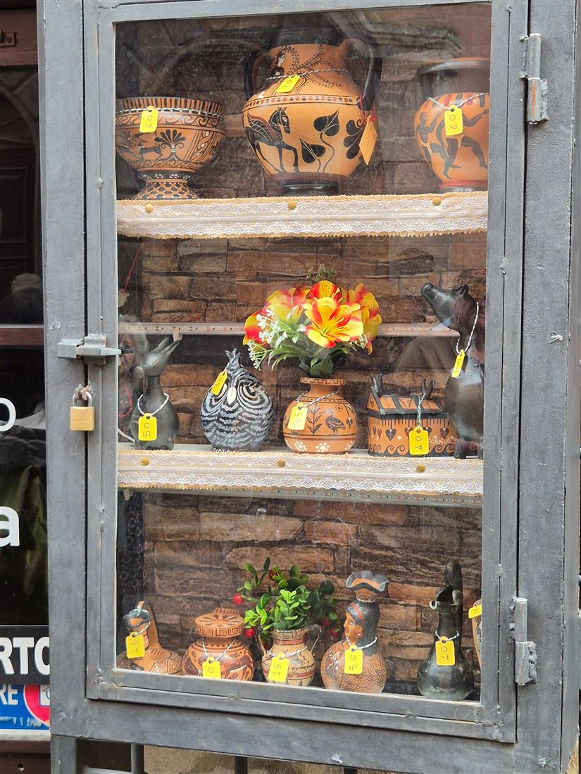 een winkel met allerlei replica's van Etruskische aardewerk. Jan is