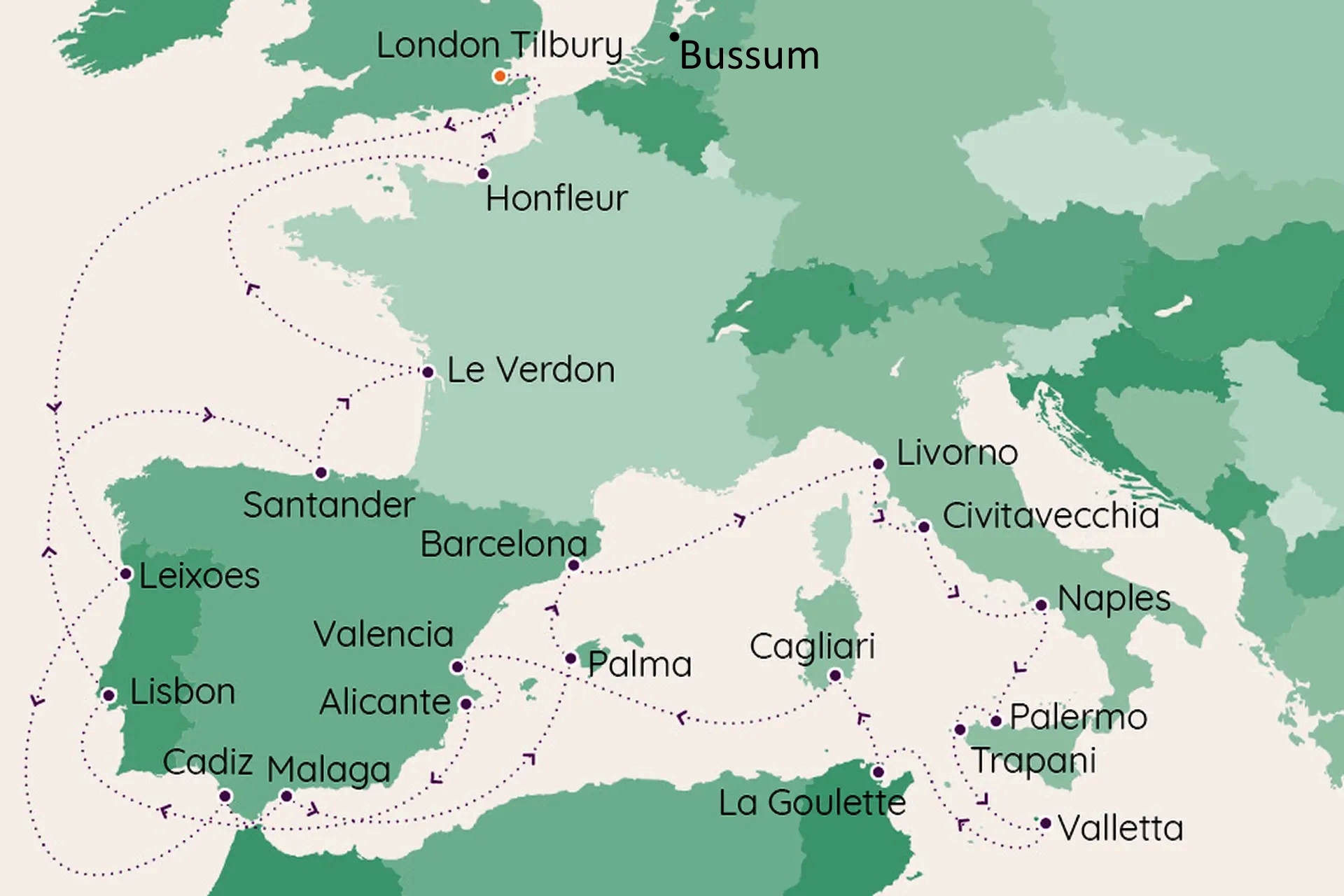 Bussum (NL) - Hoek van Holland (NL) - Harwich (UK) - Tilbury (UK) - Leixões (Port) - Cadiz (Sp) - Malaga (Sp) - Palma de Mallorca (Sp) - Barcelona (Sp)
